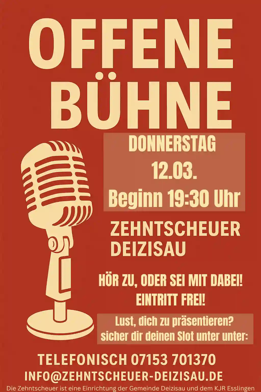 Falls ihr lust auf einen Slot habt, könnt ihr euch gerne unter : tickets@zehntscheuer-deizisau.de, oder einfach telefonisch unter: 07153 / 701370 anmelden.